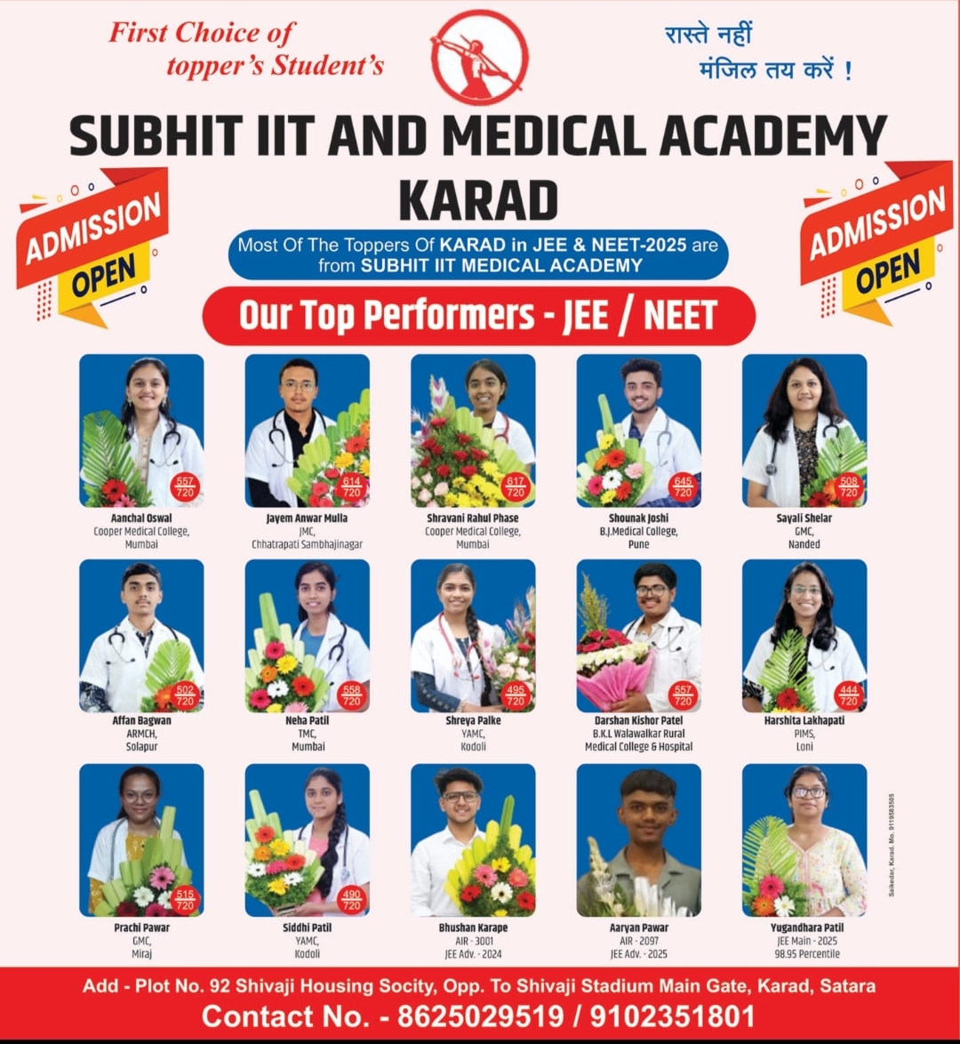 जेईई (JEE) आणि नीट (NEET) सारख्या राष्ट्रीय स्तरावरील स्पर्धा परीक्षांसाठी पुणे-मुंबईकडे धाव घेण्याची गरज आता कराडच्या विद्यार्थ्यांना उरलेली नाही. कराडमध्येच राहून जेईई-नीट टॉपर्स घडविण्याची संधी येथील सुभित आयआयटी अँड मेडिकल अकॅडमीने उपलब्ध करून दिली असून, 2026 च्या बॅचसाठी मर्यादित प्रवेश प्रक्रिया सुरू झाली आहे, अशी माहिती अकॅडमीचे संचालक सुभित यादव यांनी दिली.